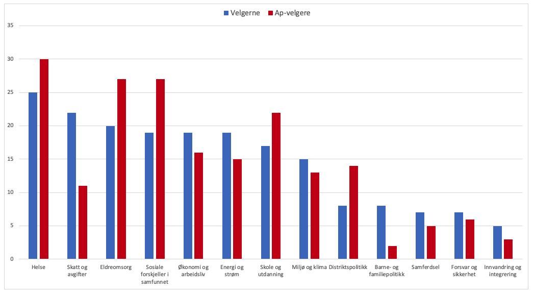 Det som kanskje er slående er hvor langt ned på lista forsvar og sikkerhet kommer, både blant velgerne generelt og Ap-velgerne spesielt, gitt krigen som raser i Ukraina og alt fokuset på 2-prosentmålet og all bistand, både økonomisk og med utstyr, vi bidrar med til Ukraina. Og kanskje ikke minst at regjeringen på inn- og utpust legger skylden på denne krigen for alle de økonomiske nedturene for folk flest. Gitt Ap-velgernes fokus på sosiale forskjeller i samfunnet, er det interessant at de i så liten grad bryr seg om skatter og avgifter. Heller ikke energi og strøm opptar dem nevneverdig.