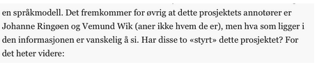 Jeg vil bede dig fjerne navnene på Johanne Ringøen og Vemund Wik fra din artikel. Som du selv nævner, ved du ikke, hvem de er, men alligevel mistænkeliggør du dem og deres arbejde. De er annotører, der har fulgt en klar guide. De skal ikke mistænkeliggøres på denne måde.