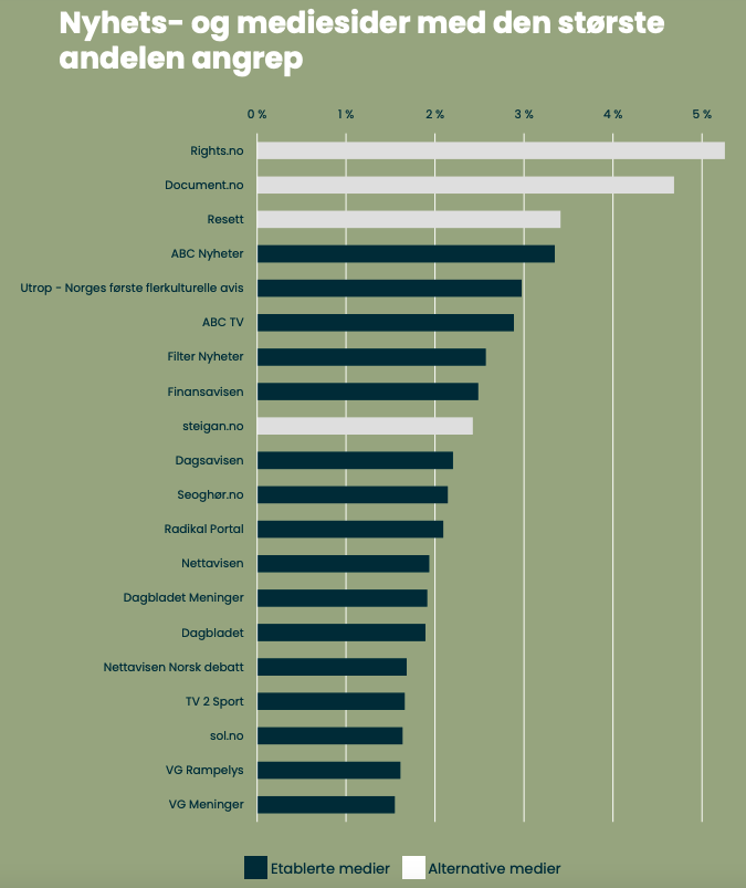 Flere av mediesidene som har den høyeste andelen angrep, finnes utelukkende i digital versjon, for eksempel Rights.no, Document.no, Resett og ABC Nyheter. Og nettsidene til de store, tradisjonelle (papir)mediene som Aftenposten og VG glimrer med sitt fravær. Moderering er en sannsynlig forklaring på dette.