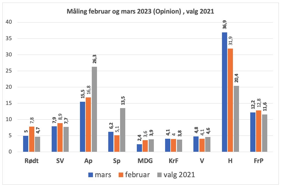 Dagens Opinion-måling viser at Høyre og FrP (til sammen 49,1 prosent) alene kunne dannet flertall (89 representanter, 85 er flertall). Hvis Venstre og KrF også ble med, ville det gitt totalt 58 prosent, til sammen 104 representanter.