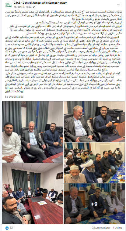 Bildekarusellen viser Johansens hjertelige deltakelse, og på ett av bildene kan det tilsynelatende se ut til at han leder en bønn. På et annet sitter han sammen med imamen Nehmat Ali Shah. At han har ledet bønn om de totalitæres stemmer ved det forestående valget til høsten er det uansett ingen tvil om. Når man trykker på den automatiske oversettelsen av teksten, kan man lese som følger: