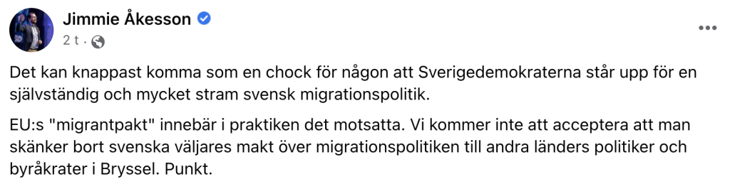 «Vi vil ikke akseptere at svenske velgeres makt over migrasjonspolitikken gis bort», skriver Åkesson på Facebook.