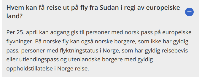 To dager etter Huitfeldts første pressemelding om de anslagsvis 80 norske borgerne i Sudan, opprettet altså regjeringen en informasjonsside. Der framkommer det at det slett ikke bare er norske statsborgere i Sudan som kan evakueres. Blant mange spørsmål og svar framkommer som følger: