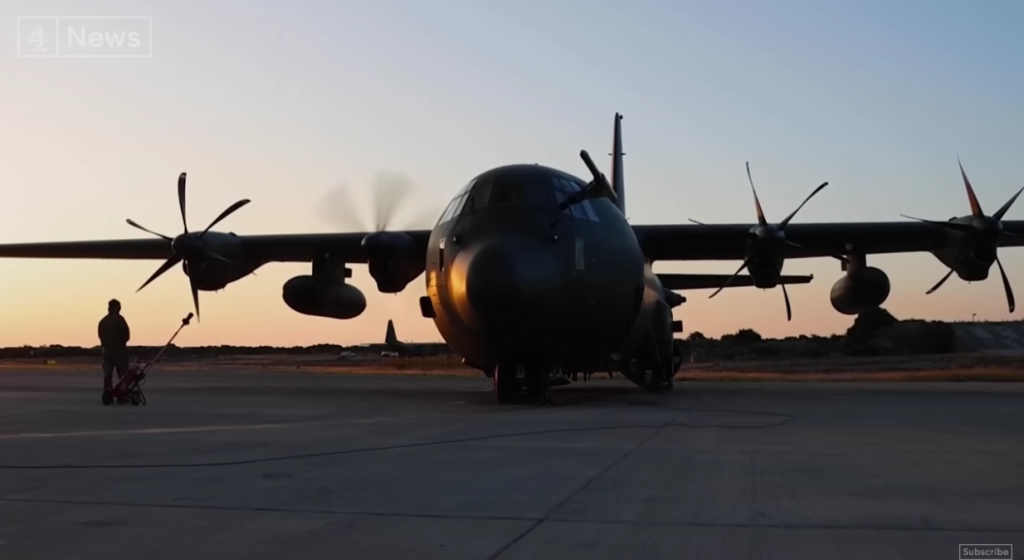 Hovedillustrasjon: Skjermdump av Hercules evakueringsfly, Channel 4 News.