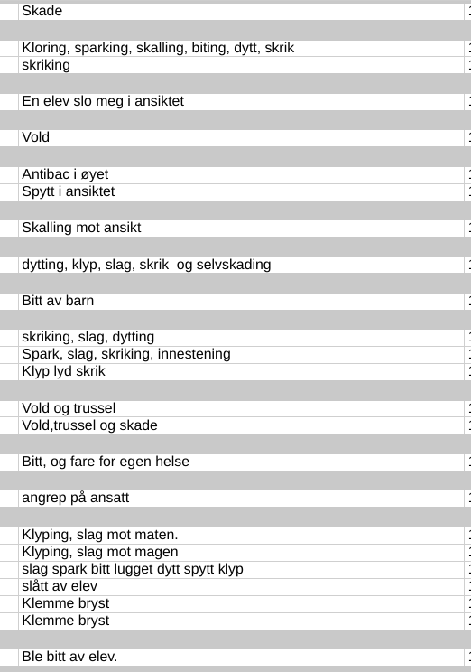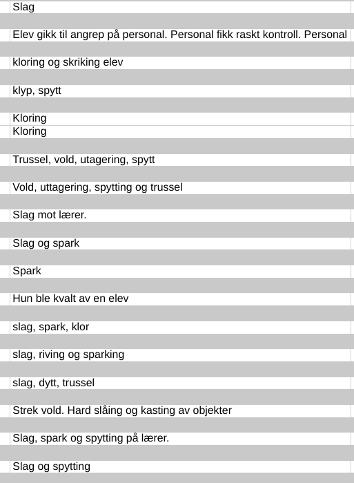 Skjermdumper hentet tilfeldig ut av materialet (legg merke til at dette er andre skjermdumper enn vi tidligere har brukt i saken HRS fikk voldsoversikten som Utdanningsetaten ville holde hemmelig, red.anm.):