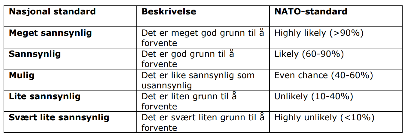 Innen fagfeltet politisk motivert vold – ekstremisme – brukes et sett med standardiserte sannsynlighetsord. Formålet med disse er å skape en mer ensartet beskrivelse av sannsynligheten i vurderingene og derigjennom redusere uklarhet og misforståelser. Begrepene og de tilhørende beskrivelsene er utarbeidet i et samarbeid mellom politiet, Forsvaret og PST.