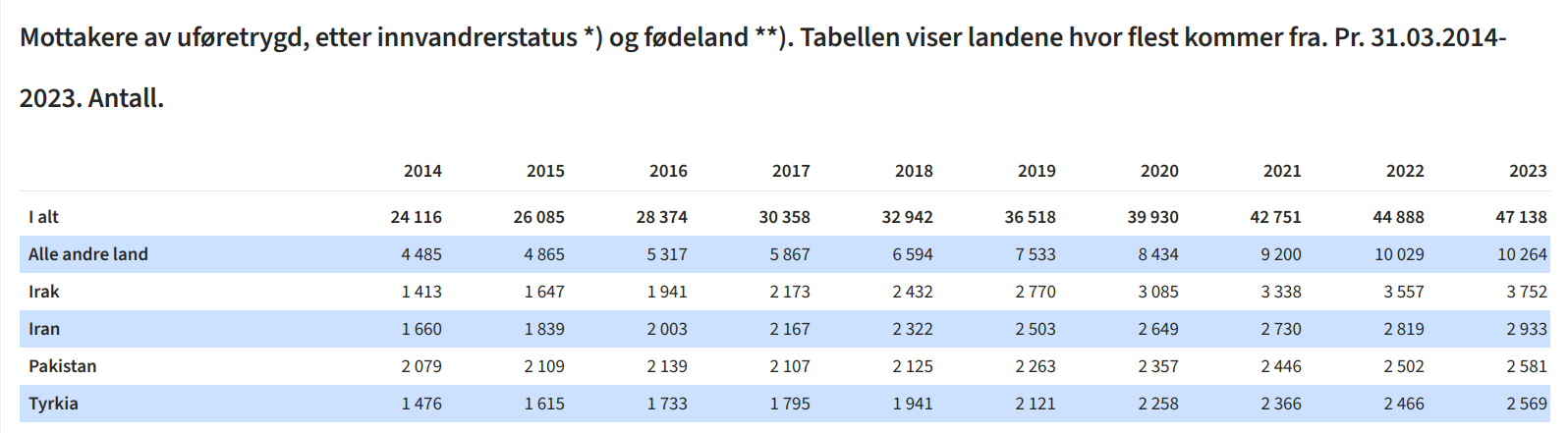 Den oppmerksomme leser kan i tillegg merke seg økningen i antall siste ti år. Nå skal satsene opp, og milliardene vil rulle ut. Beregner man at disse mottar et gjennomsnitt av minstesats hver seg, noe som er et forsiktig anslag, mottar de i utgangspunktet 288.000 kroner hver årlig. Det betyr at uføretrygdede fra Irak, Iran, Pakistan og Tyrkia alene koster fellesskapet 3,4 milliarder årlig.