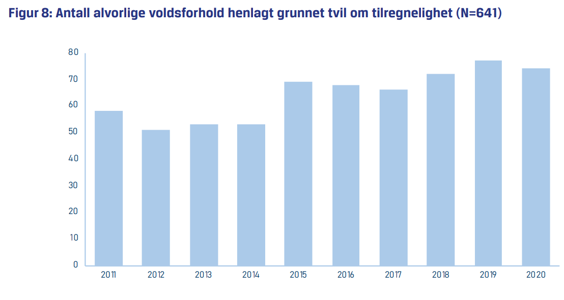 Ser vi samlet på figur 7 og 8, ser vi at antallet saker er høyere i årene 2015–2020 enn i de foregående årene (min uthev.) Antallet alvorlige voldsforhold idømt TPH er lavt, og det er dermed grunn til i større grad å vektlegge utviklingen i alvorlige voldsforhold henlagt grunnet tvil om tilregnelighet. Antallet alvorlige voldsforhold idømt TPH er imidlertid ikke påvirket av enkeltpersoner med svært mange voldsforhold.