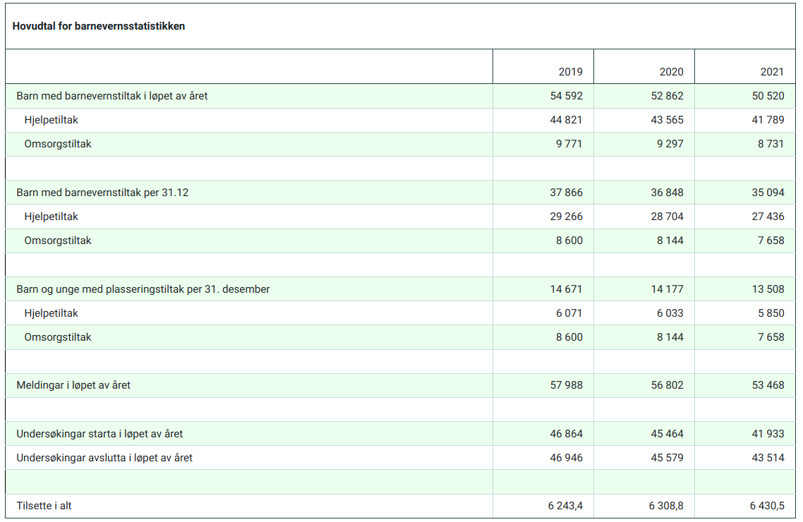 Tallene er riktig nok noe på vei nedover, men på samme tid er de skyhøye fremdeles. I 2019 mottok norsk barnevern nær 58.000 bekymringsmeldinger, mens tallet for 2021 er i overkant av 53.000 meldinger.