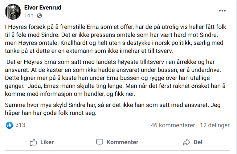– Dette leder til et interessant spørsmål: Hva sier det om karakteren til en statsministerkandidat at hun har stilt til valg i 2013 med en notorisk banditt av en ektefelle, og at hun nå må legge absolutt all skyld for denne suppa på denne løgnhalsen av en sunnmøring som hun er gift med?
