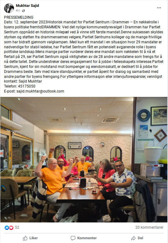 Mukhtar selv er stolt som en hane, og har lagt ut en «PRESSEMELDING» på sin egen Facebook-side. Flankert av noen jublende kjerringer, beklager, kvinner, feirer han valgresultatet.