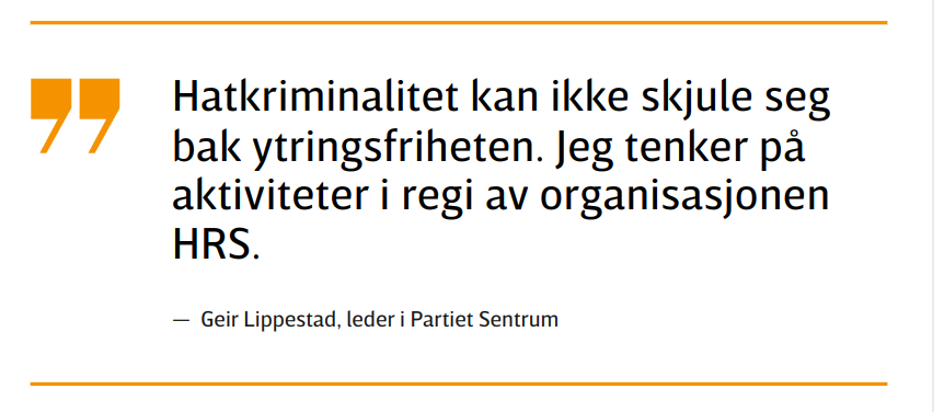 «At vi har én organisasjon som ikke er politisk korrekt er ikke et problem. HRS har gjort en god jobb med problemer mange ikke vil ta i med ildtang. Støre må slutte å dyrke splittelsen. Vi er alle mot voldelig ekstremisme, og jeg er enig med Geir Lippestad i at oppgjøret ble tatt i domstolene»