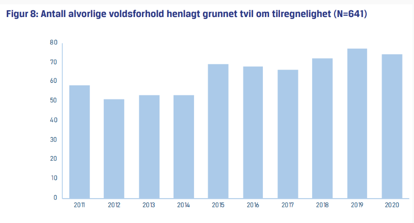 Ser vi samlet på figur 7 og 8, ser vi at antallet saker er høyere i årene 2015–2020 enn i de foregående årene (min uthev.) Antallet alvorlige voldsforhold idømt TPH er lavt, og det er dermed grunn til i større grad å vektlegge utviklingen i alvorlige voldsforhold henlagt grunnet tvil om tilregnelighet. Antallet alvorlige voldsforhold idømt TPH er imidlertid ikke påvirket av enkeltpersoner med svært mange voldsforhold.