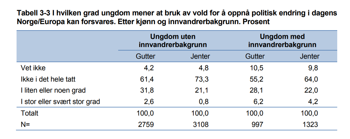 Hvilken endring det er ønskelig å oppnå ved voldsbruk, stilles det derimot ikke spørsmål ved i undersøkelsen. Dersom man kan mistenke at muslimske unge er villige til å bruke vold for å få økt aksept av sharialoven, er tallene skremmende. Det tallene unektelig viser er at de muslimske ungdommene er mest tilbøyelige til å støtte de mest ytterliggående standpunktene, samtidig som andelen som svarte «vet ikke» i all hovedsak befant seg i innvandrertette bydeler.
