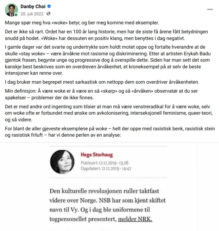 Det Danby Choi driver med når han bruker Hege som eksempel er ikke woke, det er bare posisjonering, det kan man med enkelhet vite. Det finnes nemlig ikke et eneste ekte woke menneske som noen gang beklager verken hva de sier eller gjør. Heges beklagelse kom like kjapt som Minervaredaktøren, i klokkeren moralsk woke-overlegenhet, i sin tid framsatte krav om tap av statsstøtte for HRS for fargehumoren. Kravet ble selvsagt kopiert av selverklært viktige stemmer i den samme politikkdiskuterende andedammen på Facebook, det er jo viktig å late som det samme som det de man vil holde seg inne med later som, må vite.