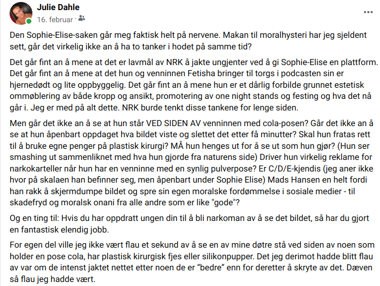 Tja, nå har vi som nevnt ikke lest boka, men jeg kan for egen del gjøre nok et forsøk på å forklare Stephansen hva i alle fall jeg tenkte da influenceren fikk hele landets pekefingre rettet mot seg. Jeg skrev om det på egen Facebook-profil.