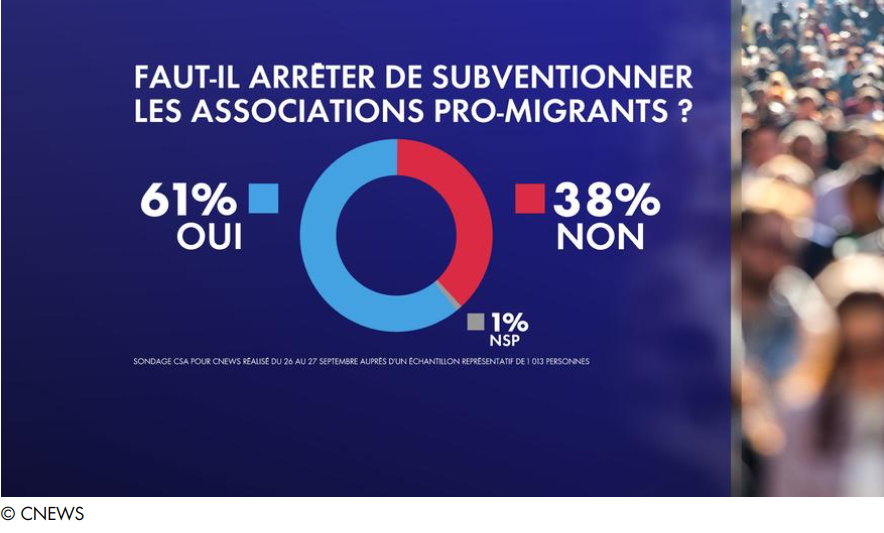 Forslaget om å halvere budsjettet til asyllobbyen finner klangbunn i det franske folket, skal vi tro en undersøkelse som ble utført av CSA-instituttet for CNEWS. Resultatene ble publisert 28. september, og totalt er 61 prosent av respondentene for å kutte all støtte til NGOene.