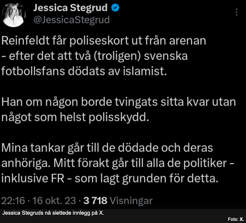 Nå slettet Stegrud raskt innlegget, antakelig ut fra en rekke reaksjoner. For Stegrud burde ha husket hvilket land hun bor i. Hun bor i et et land der sannheten har trange kår, noe som også er grunnen til at Sverige er der de er i dag. Og her har både politikere og mediene skylden.