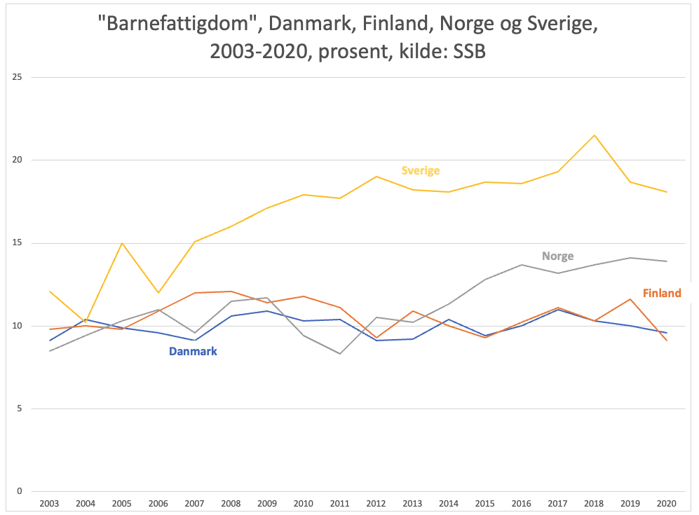 I rapporten Barn i lavinntektshusholdninger i Norden: 2005-2020 fremkommer det at i 2004 lå samtlige nordiske land på en barnefattigdom (barn i husholdninger med lavinntekt) på rundt 10 prosent. Men året etter stakk Sverige av, og havnet på 15 prosent, for så å gå ned til 12 prosent. Så har det bare gått oppover, inntil en topp i 2018 (21,5 pst), men den i 2020 lå på 18,1 pst.