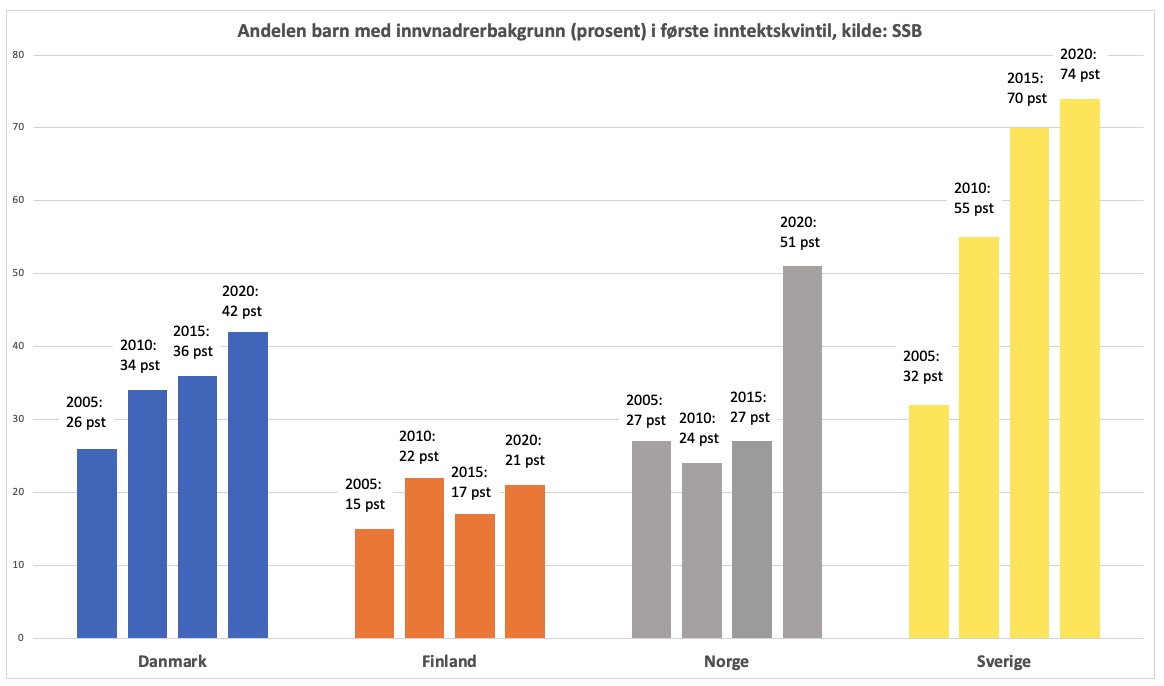Både Sverige og Norge har i perioden 2005-2020 opplevde en betydelig konsentrasjon av barn med innvandrerbakgrunn i den fattigste femdel av inntektsfordelingen. Se figur under.