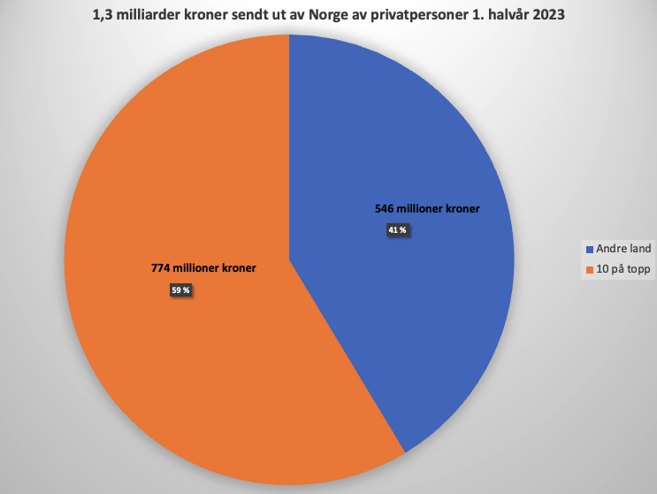 Av de 1,3 milliarder kroner er 59 prosent (774 428 257 kroner) ført ut til 10-på-topp-landene, mens andre land står for de resterende 41 prosent (som utgjør 546 271 501 kroner).