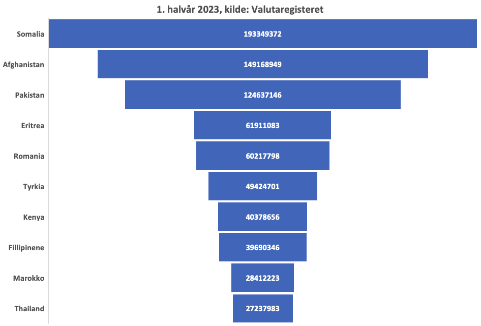 Også i første halvår i år sendes det mest penger til Somalia. Over 193 millioner kroner (193 349 372 kroner) hadde mest sannsynlig somaliere i Norge råd til å avse til noen i Somalia, kanskje seg selv. For som kjent ferierer mange «flyktninger» i Norge i landet de angivelig flyktet fra, og mange (?) holder sine barn/unge på lengre opphold i landet.