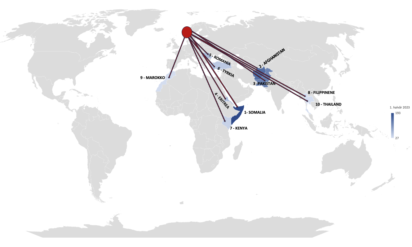 Til Pakistan ble det sendt ut i underkant av 125 millioner kroner (124 637 146 kroner), som er noe mindre enn første halvår i fjor (da lød det på ca. 164 millioner kroner). Så følger det slag i slag, minst penger av 10-på-topp ble sendt til Thailand med «bare» i overkant av 27 millioner kroner.