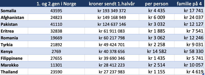 At over 194 millioner kroner ble sendt av privatpersoner til Somalia betyr at det utgjør over 4.400 kroner per person, liten som stor, på seks måneder relatert til gruppens størrelse i Norge. Ifølge Statistisk sentralbyrå var det registrert nesten 43.600 personer i 1. og 2. generasjon med somalisk bakgrunn i Norge ved inngangen til 2023. Hvis vi for eksempel regner med at en somalisk familie består av fire personer tilsier det at denne familien i løpet av et halvår kan avse over 17.700 kroner i perioden.