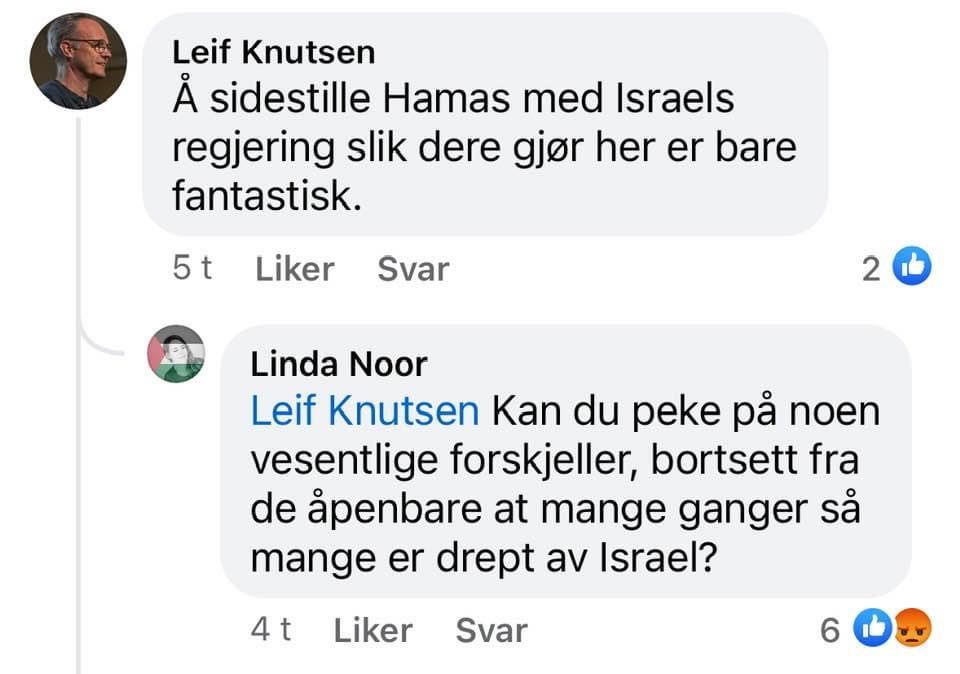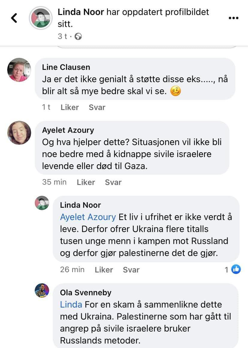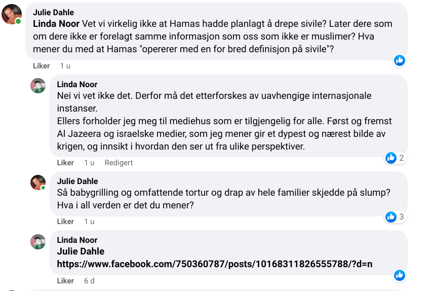 Det foregår mer interessant på samme Facebook-side, for der dukker jevnlig konvertitten Linda Noor også opp. Hun hevder i fullt alvor at ingen vet om Hamas planla å drepe sivile i Israel, et argument hun tviholder på. Dersom du vil lese hele tråden, ligger den her.