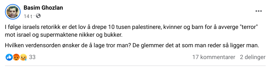 Ghozlan har siden terrorangrepet 7. oktober iherdig hevdet at Hamas bedriver forsvar og frigjøringskamp. Bit merke i «terror». Det er satt i hermetegn av nettopp denne grunn. Men mer interessant er hva Ghozlan utdyper nærmere i tråden under innlegget. Der skriver han som følger (mine uthevinger):