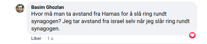 Det som er verdt å merke seg er at både Ghozlan og Noor er klokkeklare på dette ene: Hamas og det palestinske folket er ett og samme. De skiller ikke, men anser Hamas som en legitim opprørsstyrke. Den samme holdningen ser man tydelig i de pro-palestinske demonstrasjonene over hele den vestlige verden. De roper ikke om å knuse Hamas eller om å redde palestinerne fra Hamas. Det er Israel de vil knuse, derom hersker ingen tvil. Mens de samme aktørene offentlig tar til orde for å stoppe antisemittisme, kan absurditeten best illustreres med Basim Ghozlans egne ord om en foreslått fredsring rund synagogen i Oslo: