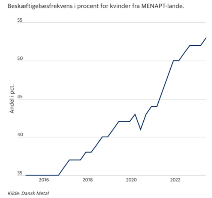 En ny analyse fra Dansk Metal viser at flere innvandrerkvinner tar på seg «arbeidsplikten», som ikke minst statsminister Mette Frederiksen (S) har påpekt gang på gang. Dette var en gruppe som også i hennes åpningstale i Folketinget 3. oktober fikk spesielle ord med på veien. Hun understreket at alle innbyggere, også kvinner med ikke-vestlig bakgrunn, skal bidra til samfunnet ved å delta på arbeidsmarkedet.