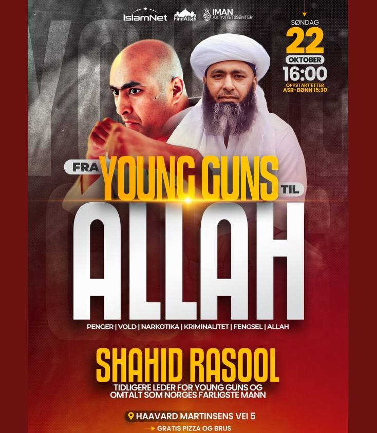 På Facebook-siden Finn Allah, som er direkte knyttet til dawah-senteret, ble det nylig lagt ut invitasjon til temakveld ved senteret, der tidligere Young Guns-leder Shahid Rasool skulle fortelle om veien fra å være Norges farligste mann til å bli Allahs lydige tjener.