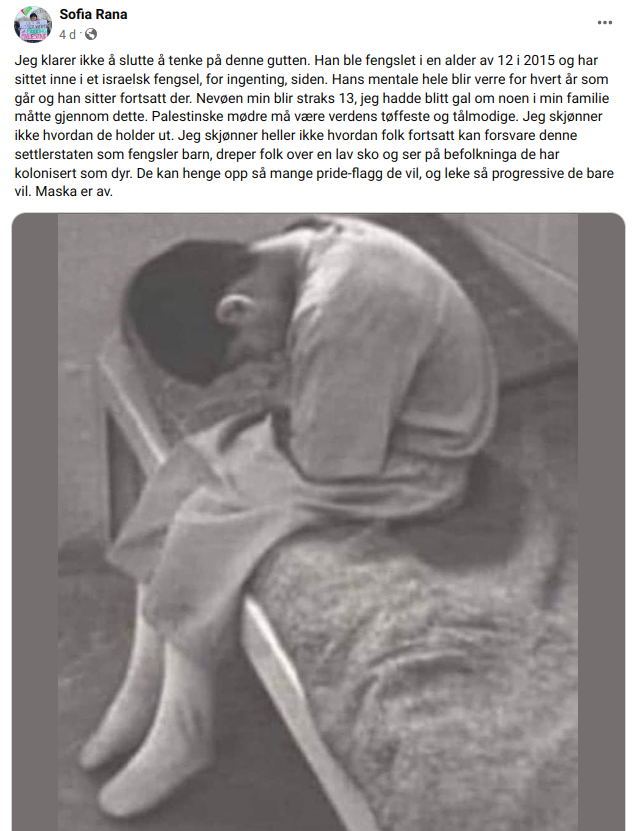 «Palestinske mødre må være verdens tøffeste og tålmodige. Jeg skjønner ikke hvordan de holder ut. Jeg skjønner heller ikke hvordan folk fortsatt kan forsvare denne settlerstaten som fengsler barn, dreper folk over en lav sko og ser på befolkninga de har kolonisert som dyr», skriver Rana.