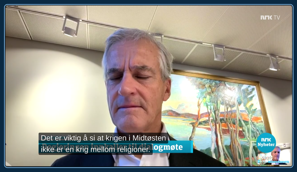 – Ja, det er viktig å si at krigen i Midtøsten, er jo ikke er en krig mellom religioner. Ofte blir det en overføring kan man si, på den måten til, eh, som engasjerer religiøse samfunn, men det er tross alt en inngang for oss til å kunne nå ha en samtale i Norge, med, eh, det mosaiske trossamfunn, med jødene våre, med muslimske dialognettverk, katolske kirker, kristne menigheter… Det er stort engasjement. Det er mange som har slekninger som er nå berørt, kjenner folk og er nå veldig preget av dette. Og vi skal jo fortsatt ha det trygt i norske gater. Vi skal ha mulighet for å snakke sammen om det som skjer. Norge er jo sterkt engasjert i å få til en våpenstillstand og komme med unnsetning til de som lider nå veldig brutale overgrep i Gaza. Og Norge har fordømt de fryktelige terrorangrepene som Hamas rettet mot Israel for litt over tre uker siden, forklarte Støre.