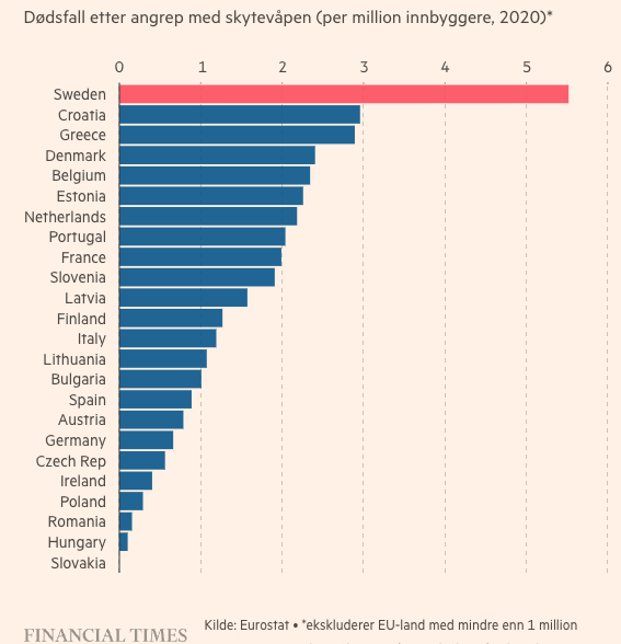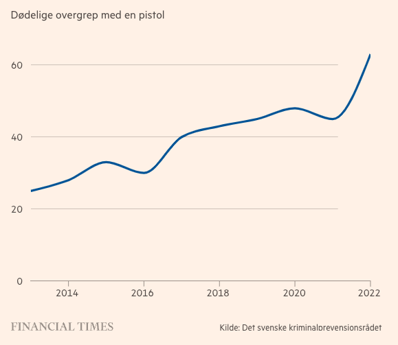 Ved utgangen av oktober i år hadde det vært 48 dødelige skytinger i dette landet på 10,5 millioner mennesker, skriver FT, og peker på at det i 2022 var en rekord på totalt 62, opp fra 45 i 2021. Hvor Sverige havner for 2023 gjenstår å se, men med flere skyteepisoder i uken, for ikke å si daglig, er sjansen absolutt tilstede for å slå 2022-rekorden.