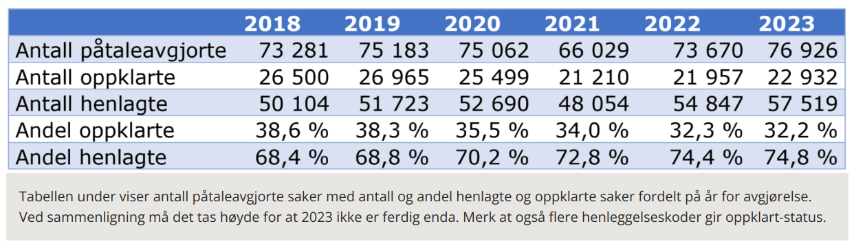 «Merk at flere henleggelseskoder gir oppklart-status» står det til og med. Og tallene viser to forhold; Antallet kriminelle handlinger som anmeldes øker, og det samme gjør antall henleggelser. Mens det i 2018 var en henleggelsesprosent på 68,4 prosent, er tallet oppe i 74,8 prosent i begynnelsen av desember i år.