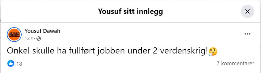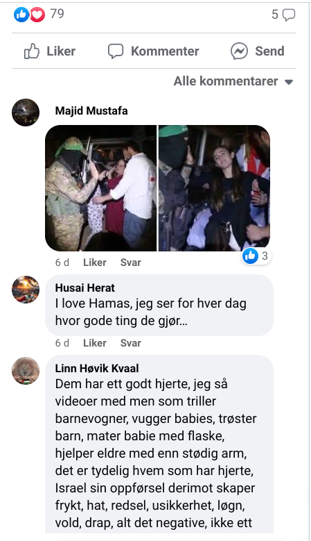 I gruppen er det selvsagt også stort engasjement for krigen i Midtøsten. Mens det har virket vanskelig å få moské-islam til å ta avstand fra Hamas, slik vi har belyst i flere saker om antisemittismen som florerer blant annet på siden til Rabita-moskeens Basim Ghozlan, er det ikke bare pro-palestinsk kamp som pågår i den nye muslimske Facebook-gruppen. Det er regelrett hyllest av Hamas. De er ikke terrorister, tvert i mot er de skjønne mennesker, fastslås det, mens det framholdes at israelere er svært onde terrorister.