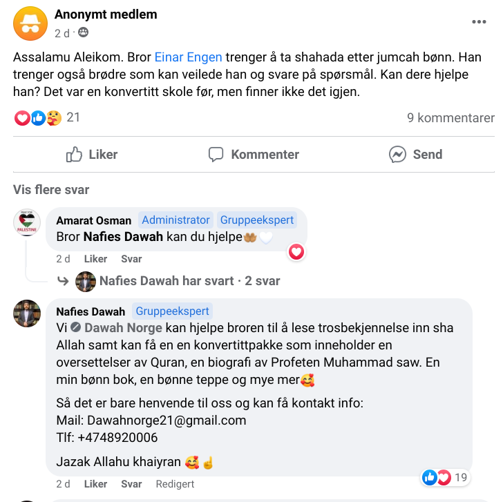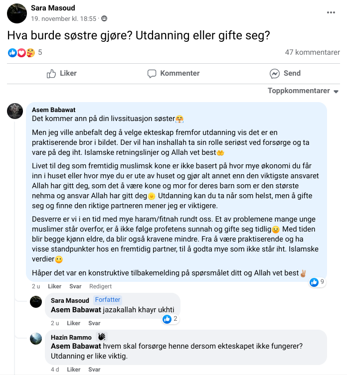 Uten å ta med ethvert publisert spørsmål av typen «er stipend haram?», «kan jeg som mann jobbe et sted der det jobber kvinner?» og de like oppsiktsvekkende svarene på alskens problemstillinger, kan vi i alle fall konstatere at mange kjente muslimske skikkelser har funnet veien til gruppen. Her er Leyla Hasic, mest kjent som Islamsk Råd Norges (IRN) ansikt utad da hun ble kommunikasjonsrådgiver iført nikab i 2017 og her er Mohsan Raja, Årets Osloborger 2015, for å nevne noen. At sistnevnte har dukket opp er kanskje ikke så rart. Han har pause på ubestemt tid fra adminrollen på SNP Samfunnsengasjerte norsk-pakistanere, en lukket Facebook-gruppe som ble opprettet av Raja selv og i dag har omtrent 16.000 medlemmer. Utrop belyste hvorfor Raja ikke lenger administrer gruppen; fordi han systematisk trakasserte gruppemedlemmer, deriblant en mann som sier følgende til den mangfoldige nettavisen: