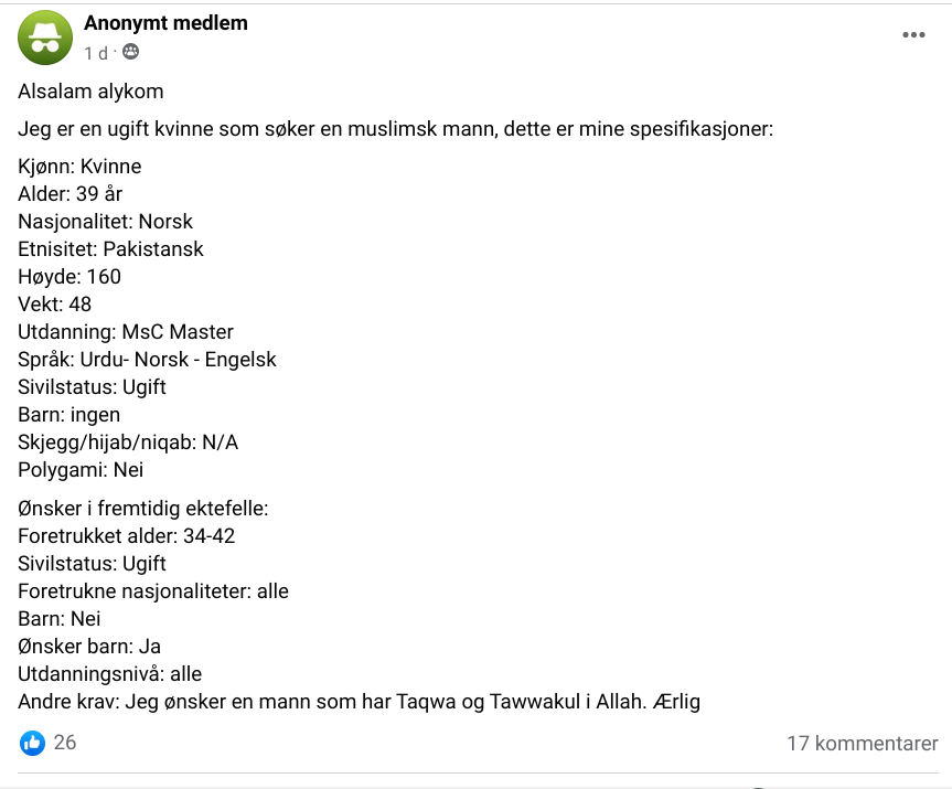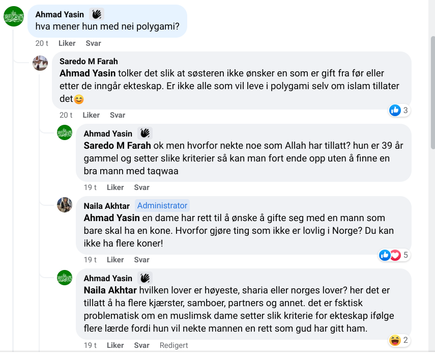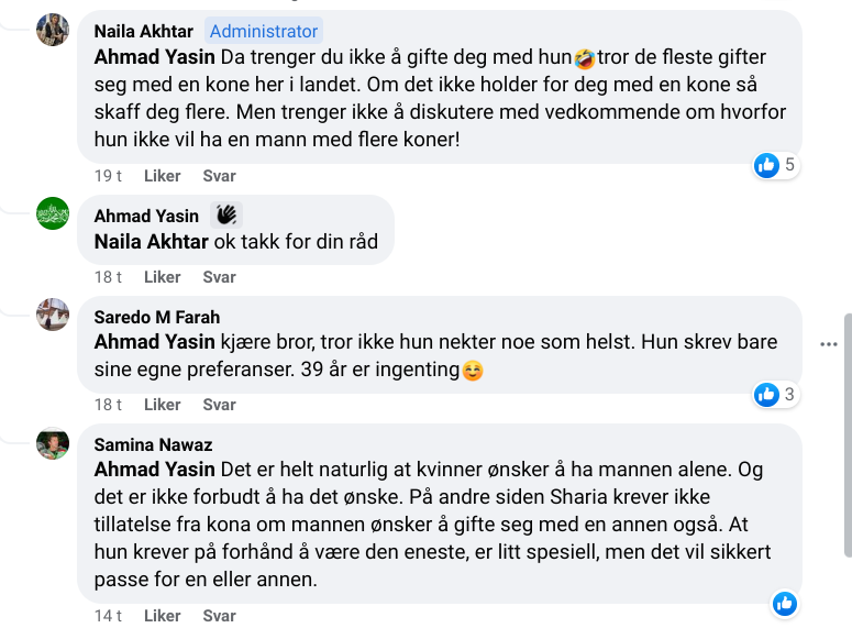 I samme kommentarfelt er det usikkerhet om hvorvidt den anonyme kvinnen kommer til å finne seg noen mann når hun er 39 og ikke ønsker at mannen skal ha flere koner. «At hun krever på forhånd å være den eneste er litt spesielt» får vi vite, for i henhold til sharia er det ikke opp til henne å avgjøre slikt, det er mannen som bestemmer.