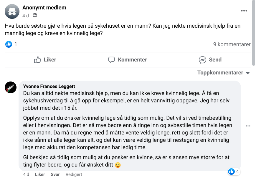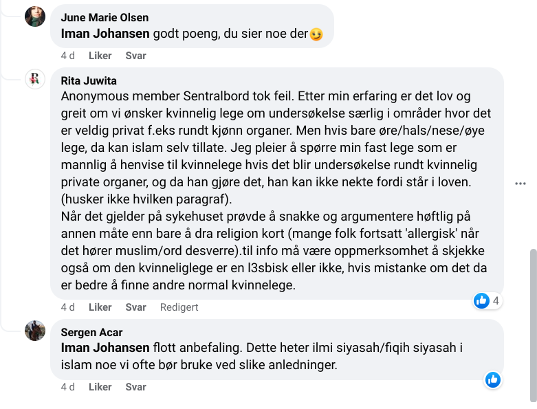 Det er flere svar i tråden, og en mann påpeker at dersom hun skal ha henvisning til spesialist, er det oftest menn som er spesialister. I skjermbildet under er det den kommentaren som besvares med «godt poeng», men så kommer en tanke den anonyme kvinnen med spørsmålet kanskje ikke hadde tenkt på. Det kan jo være haram kvinnelige leger også, tenk om legen er lesbisk? Det bør man altså sjekke før man bestemmer seg for lege i det hele tatt. En mistanke om at legen er lesbisk er nok til at man bør kreve å få en annen, fastslås det.