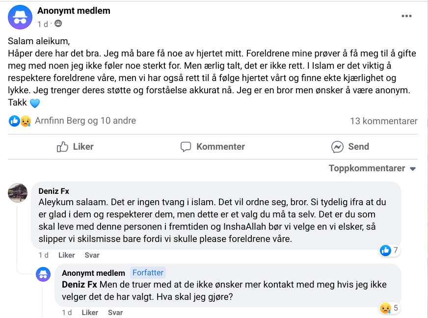 I de øvrige kommentarene kommer det gjentatte oppfordringer om å forklare for foreldrene. Støtten den anonyme fortvilede mannen som skal tvangsgiftes etterspør går ikke lenger enn det. Hvorvidt det føles støttende å høre at det ikke er noen tvang i islam når man selv står med beina godt plantet i tvang er ikke godt å si.