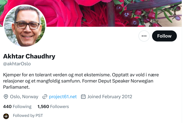 Umiddelbart synes det kanskje interessant at PST følger med på Chaudhry, men akkurat det kan være helt tilfeldig. Jeg aner ingenting om hvem som har ansvaret for å røkte PSTs sosiale mediakonti, men sikkerhetstjenesten følger også skuespiller Tom Hanks, en medielærer på Vennesla og en middagsgruppe for kvinner, så at de følger SV-eren sier egentlig ikke stort.