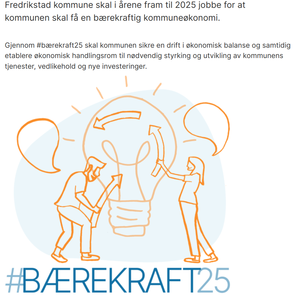 Jovisst koster de, og det fortsetter de jo også med hvert eneste år. Men det betyr samtidig ikke at kommunens øvrige utgiftsposter forsvinner. Noe måtte gjøres i Fredrikstad, og dette «noe» fikk navnet #bærekraft25. Joda, jeg ble litt pinlig berørt på Fredrikstads vegne da jeg leste akkurat den tittelen, men det ble verre av å lese på kommunens nettsider, der den påståtte bærekraften har fått sin egen illustrasjon, og der byråkratspråket er så spekket med klisjeer at det skjærer i ethvert språkøre.