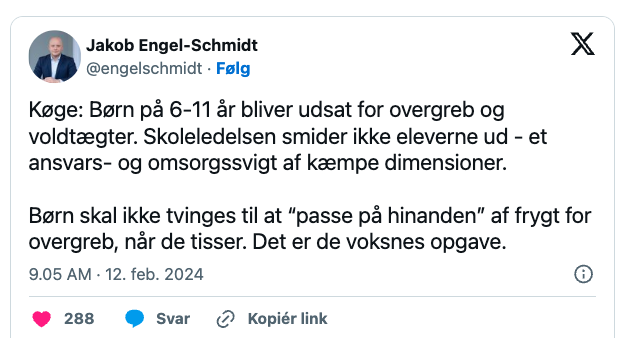 Til Berlingske skriver barne- og undervisningsminister Mattias Tesfaye (S): «Jeg vil understreke at alle barn i Danmark skal være trygge på skolen. Det må foreldre kunne stole på. Derfor er jeg også glad for at Køge kommune tar saken på største alvor.»