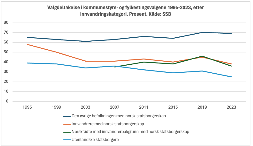 NRK viser til at ved kommune- og fylkestingvalget i fjor hadde om lag 4,3 millioner stemmerett, der nesten 750.000 hadde innvandrerbakgrunn. Statistisk sentralbyrå (SSB) har siden 1995 publisert statistikk over valgdeltakelsen til borgere med innvandrerbakgrunn. I 1995 var valgdeltakelsen blant innvandrere med norsk statsborgerskap på 58 prosent. I kommune- og fylkestingsvalget 2023 endte imidlertid valgdeltakelsen på 38 prosent.