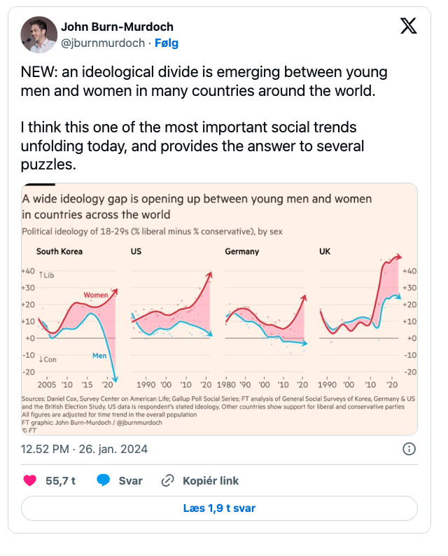 Men Skov tror lite på den teorien, ikke minst fordi unge menn trekker mer til høyre i hele Vesten, mens unge kvinner gjør det motsatte, under henvisning til John Burn-Murdoch.