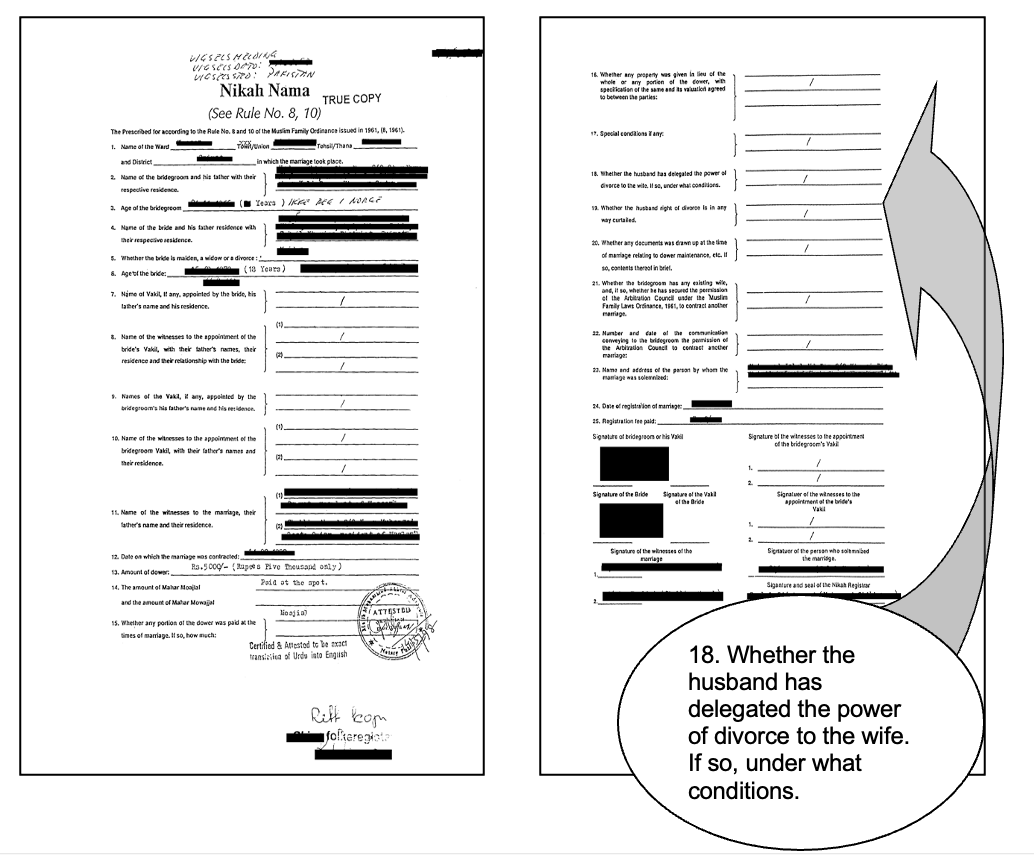 Det er, etter vår erfaring, ytterst sjeldent at muslimske kvinner i Norge eksempelvis har fått nedfelt skilsmisserett i den muslimske ekteskapskontrakten fra opprinnelseslandet. [18] En slik rett kan gis i alle muslimske ekteskapskontrakter. [19] Eksempelvis har den vanligste ekteskapskontrakten i Pakistan et eget punkt (nr.18) der det heter: Hvorvidt ektemannen har delegert skilsmisserett til hustruen. Hvis ja, under hvilke omstendigheter?