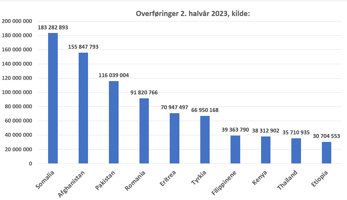 For andre halvår 2023 var beløpet 1 460 207 752 kroner, der somalierne lå på topp med 183 millioner kroner. Totalt overførte dermed somaliere i fjor totalt 373 millioner kroner.