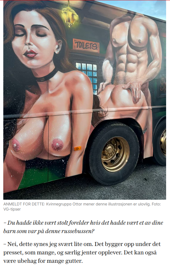 Riktignok er illustrasjoen på russebussen både harry og vulgær, men hvor er det belastende presset Støre mener å se? Hvorfor vil ikke vår egen statsminister at unge, myndige mennesker skal ha seksualitet? Og hva i all verden er det som får en statsminister i et likestilt land til å tro at gutters seksualitet er noe skittent som presses på jenter? Er Støre ikke inneforstått med at også unge kvinner har en seksualitet og at hardt tilkjempede rettigheter for kvinner innebærer ikke bare å si nei, men også å initiere både kjæresterelasjoner og sex, og ikke minst innebærer retten til å si ja?
